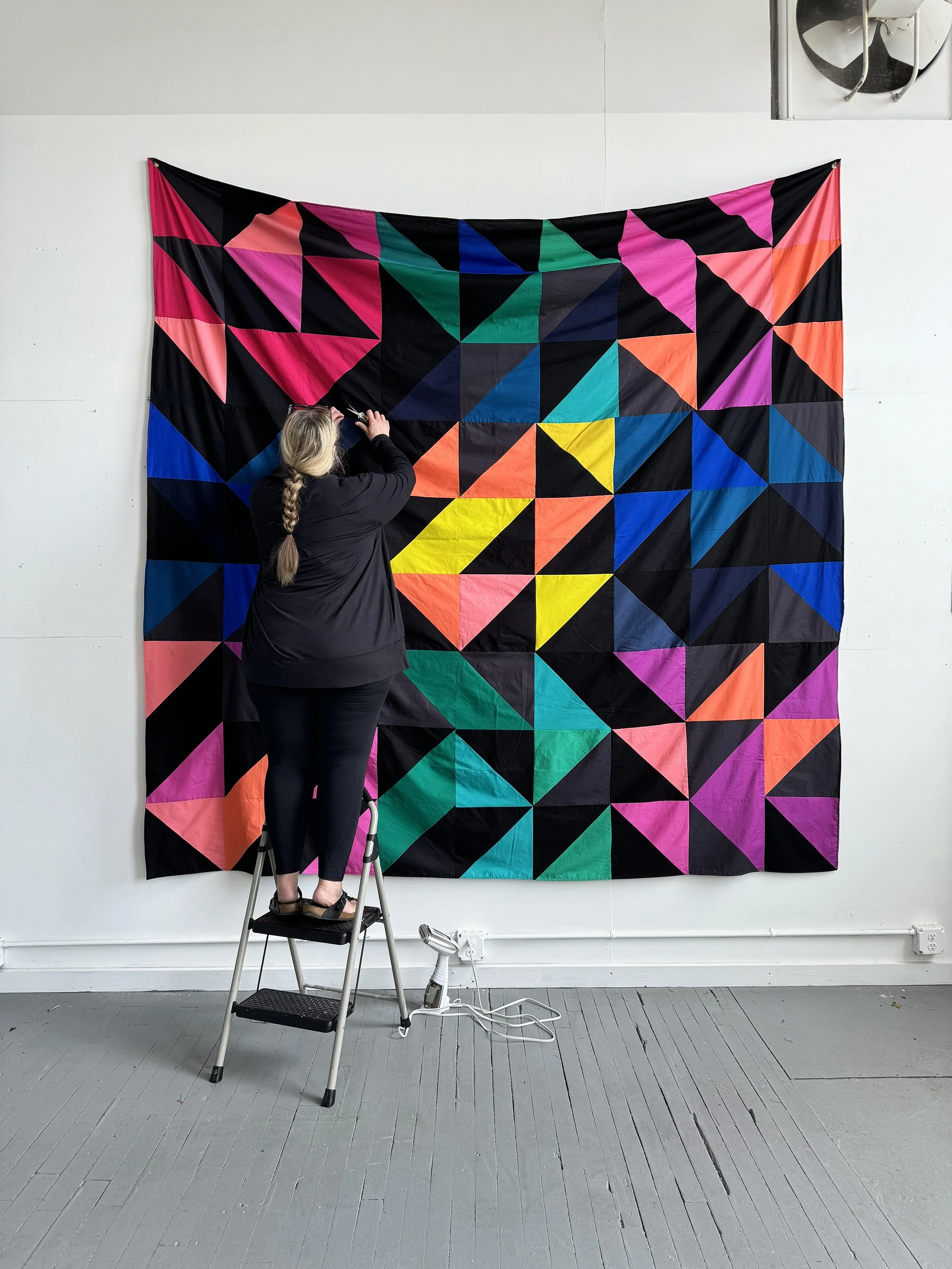 The subject of my work is unequivocally feminist: I specifically choose to work with fabric rather than paint, in reference and reverence to the fact that fiber arts were often the only type of art that women were encouraged to practice for many years throughout history. I have also been focusing on the form of the triangle in many of my recent works. The triangle is the strongest shape, physically speaking, but also symbolically as well. They often represent the female form, and I use them in my work to symbolize the strength of my personal matrilineal line, as well as the universal strength of women.